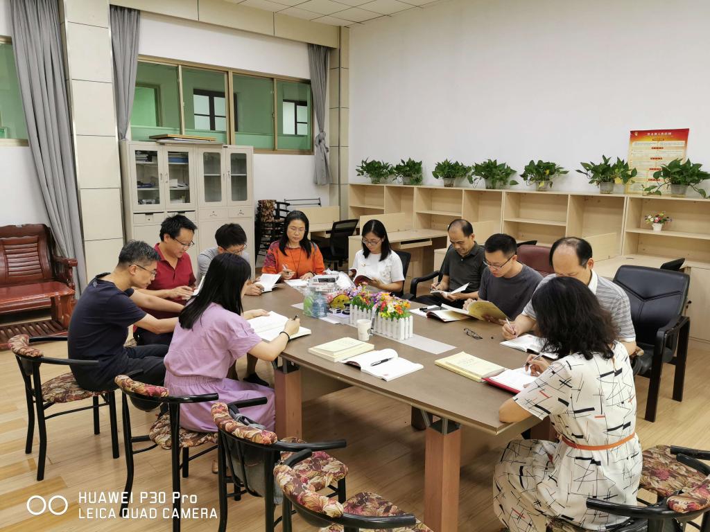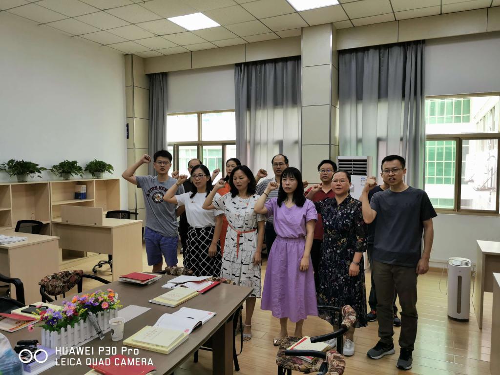 全体党员教师首先集体背诵入党誓词,然后就当天上午观看的优秀典型张富清、邹倩先进事迹视频进行了热烈讨论。接着集体学习《中国共产党章程》、《习近平关于“不忘初心、牢记使命”论述摘编》、《习近平新时代中国特色社会主义思想学习纲要》,并认真撰写学习笔记。