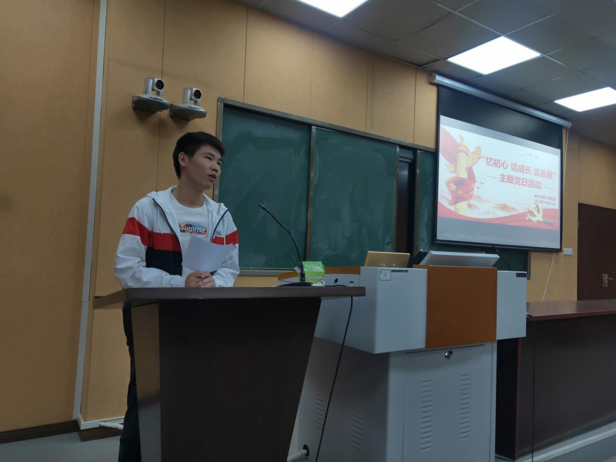 在“话成长”环节中,分别由16级三名学生党员进行发言,三名学生党员结合自身实际,分别从保研秘诀,求职经程以及学生干部经历展开陈述。