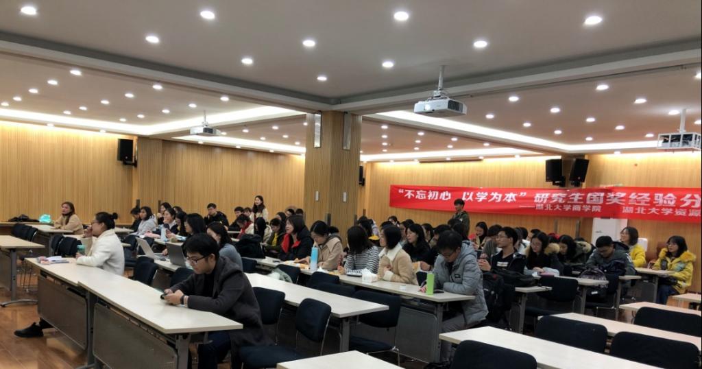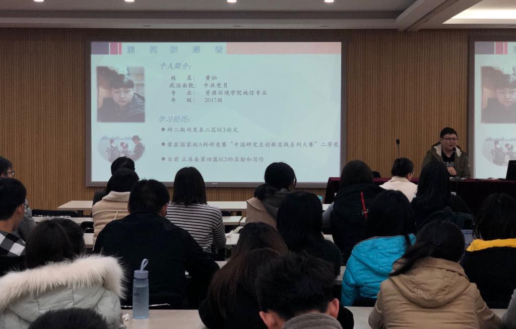 为加强研究生之间的学术文化交流,营造良好的校园学术氛围,增强学习动力,发挥优秀研究生的榜样力量,促进研究生全面发展,太阳成集团tyc151cc研究生会联合资源环境学院研究生会于11月26日18:00在逸夫人文楼C2014举办以“不忘初心、以学为本”为主题的学术科技节暨国奖经验分享会活动。本次国奖经验分享会邀请了太阳成集团tyc151cc和资环学院的国家奖学金获得者黄灿、袁自然、吴璇、骆康向大家分享做学术、写论文的方法和经验。