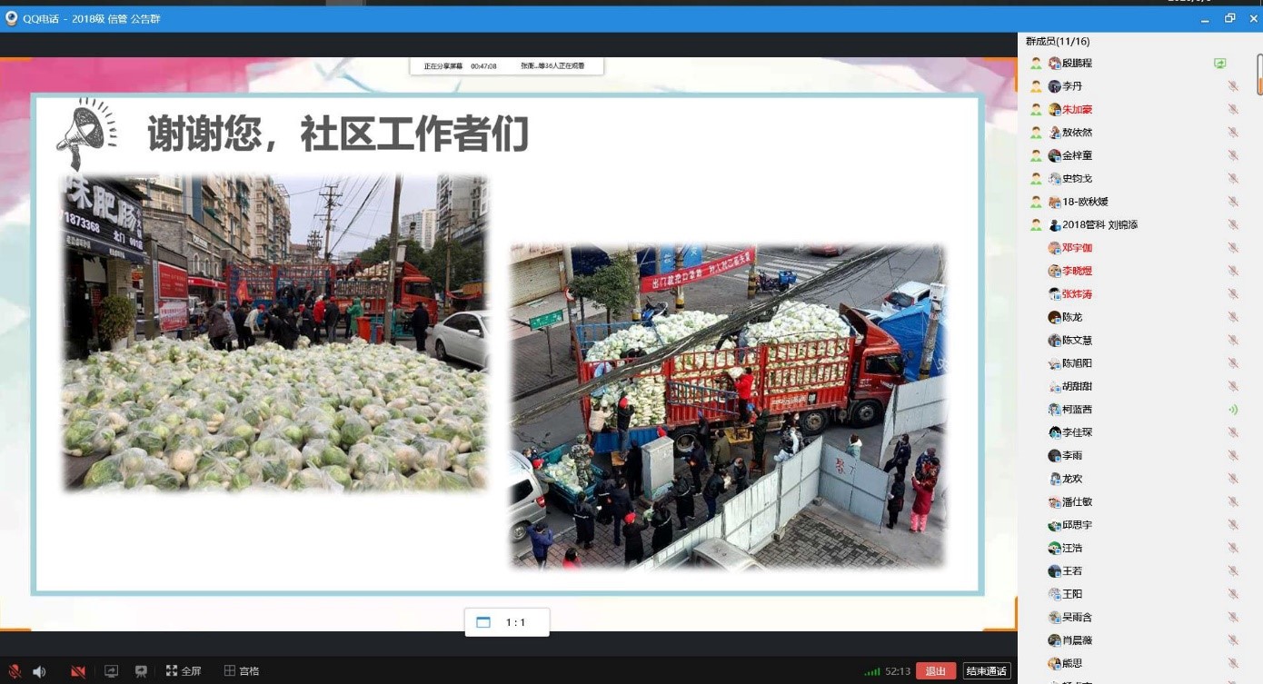 首先团支书李欣悦分享了蔡德雯,左中正,殷佳雯搜集的有关疫情的小视频,受到同学们不错的反响。