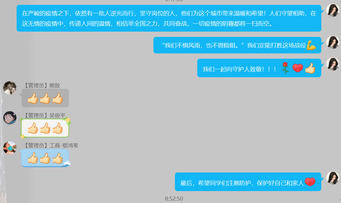 分享环节虽结束,但同学们的赞赏之情却没有停息,大家纷纷在群里对分享故事的同学进行点赞和认可。团支书在结尾这样说道: