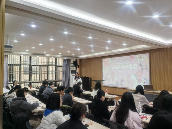 马,象征着奋斗不止、自强不息的精神,也寄托着一马当先、马到成功的祝福。“宋锦小马”挂饰DIY活动在大家的期待中拉开帷幕。指导老师为大家生动讲述了宋锦这一国家级非物质文化遗产的悠久历史与精湛技艺,让大家对这一“锦绣之冠”的独特魅力有了更深的了解。在老师的耐心指导下,平日里忙碌于工作的女教职工们,纷纷化身为心灵手巧的“匠人”。穿针引线间,精美的宋锦布料搭配流苏、串珠等配件逐渐幻化为一匹匹憨态可掬、寓意美好的小马挂件。大家一边动手制作,一边交流心得,欢声笑语不断,现场洋溢着浓厚的节日气息。
