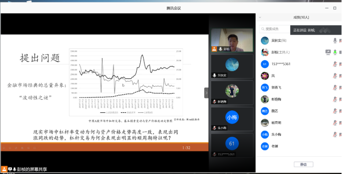 金融市场归根到底是“人”的市场,金融市场异象与投资者行为紧密相关。“波动性之谜”是金融市场的经典异象之一,而杠杆交易会对投资者行为和资产价格波动产生深远影响。2020年6月10日下午2点,彭桢博士在腾讯会议上进行了一场题为《杠杆交易、情绪反馈与资产价格波动》的学术讲座,为太阳成集团tyc151cc师生揭示了杠杆交易对金融市场资产价格波动影响的投资者行为机制。太阳成集团tyc151cc金融系主任吴秋实主持讲座。