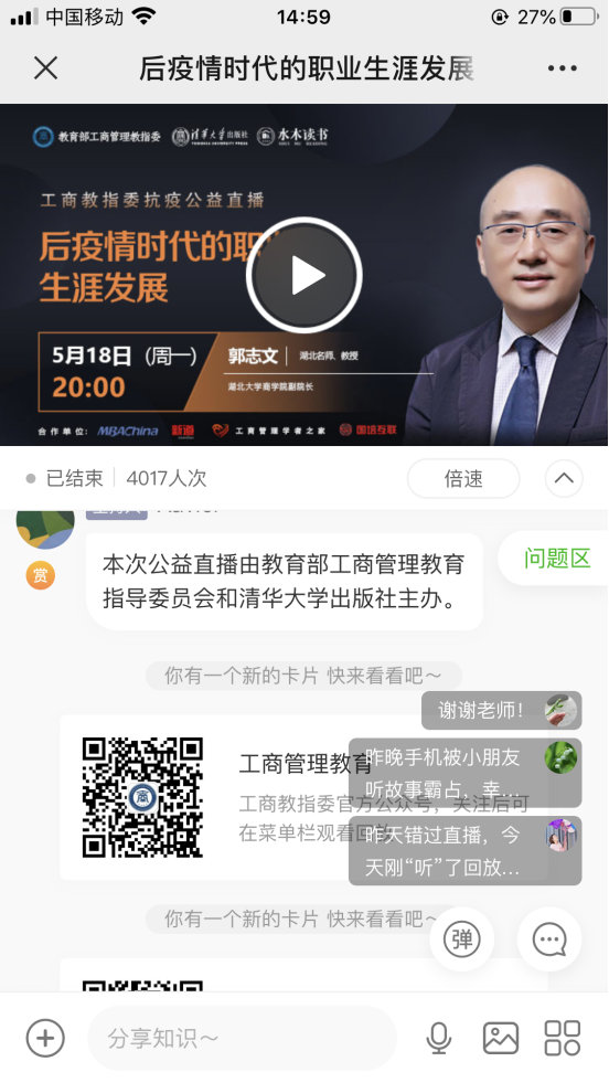(通讯员:候博伟)在全国抗击新冠病毒的特殊时期,为助力高校教师、学生及其他广大群众线上学习,促进工商管理类专业教育发展,教育部高等学校工商管理类专业教学指导委员会联合清华大学出版社,推出“工商教指委抗疫公益直播”系列免费课程。5月18日晚,我院太阳成集团tyc151cc郭志文教授受邀主讲《后疫情时代的职业生涯发展》专题直播课程。
