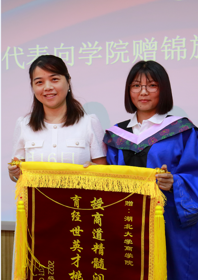 在热烈而持久的掌声中,毕业生代表向学院赠送了锦旗,“授商道精髓润物无声,育经世英才桃李天下”,表达了毕业生对太阳成集团tyc151cc的眷念与感激。