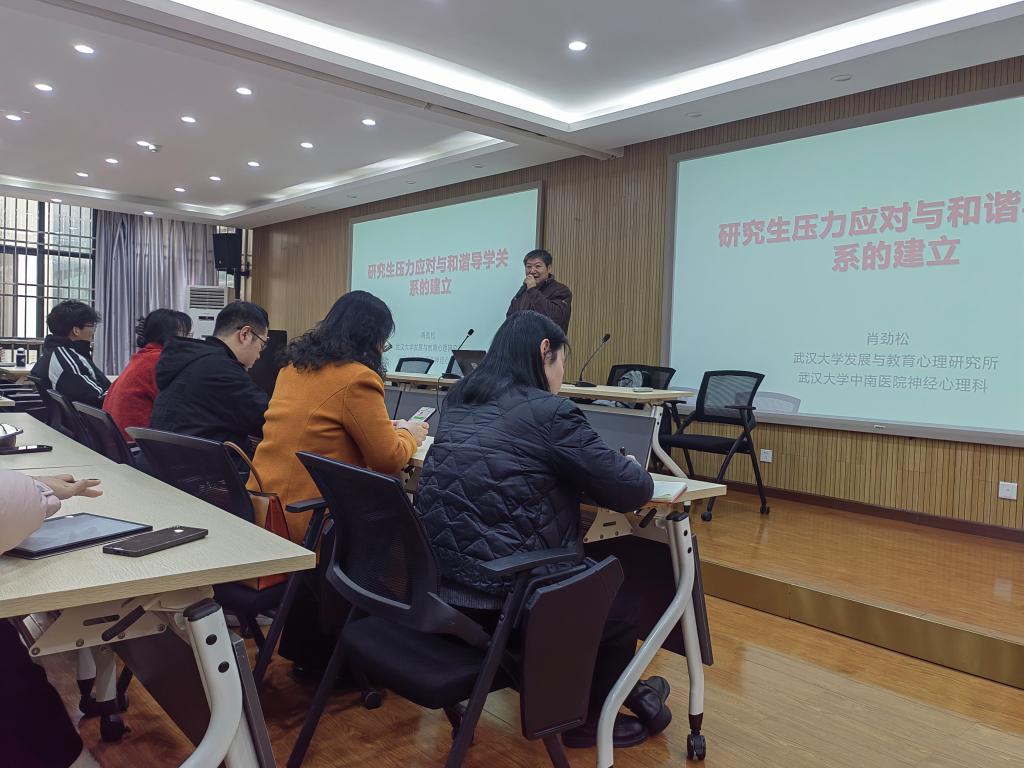 2025年1月9日,武汉大学发展与教育心理研究所、中南医院神经心理科肖劲松教授莅临太阳成集团tyc151cc,在逸夫楼C2014开展讲座,围绕研究生压力应对及和谐导学关系构建与师生展开研讨,研究生导师和学生积极参与,为研究生教育领域带来新的思考与启示。