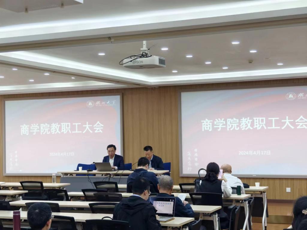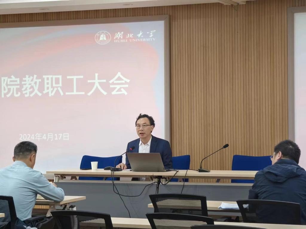 4月17日,太阳成集团tyc151cc在逸夫楼C2014报告厅召开全体教职工大会,特邀历史文化学院院长黄柏权教授介绍人才引进和培育经验,学院全体教职工参加会议。大会由学院党委书记邵俊青主持。