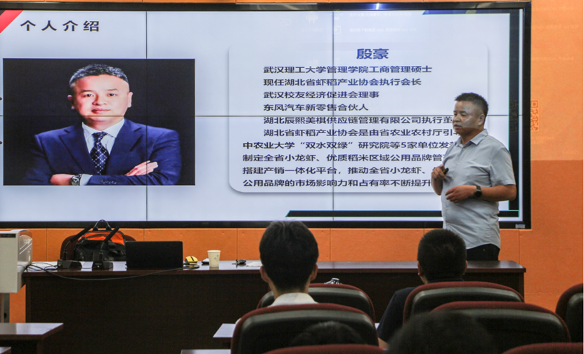嘉宾殷豪,现任湖北省虾稻产业协会执行会长、武汉校友经济促进会理事、湖北辰熙美棋供应链管理有限公司执行董事。殷豪会长从小龙虾的产业的现状,小龙虾的养殖环节、流通环节、科技支撑、公共服务、加工环节、餐饮环节、金融支持与政策保障全产业链的八个环节,对全国,尤其是湖北小龙虾产业进行了全方位、深入的介绍。湖北小龙虾产业发源于上世纪末,经浙江传入我省,借用湖北丰富的水系环境迅速发展。至今,湖北小龙虾产业已达1300余亿元,湖北“潜江龙虾”区域公用品牌价值在2022年至2023年度达到350.8亿元,连续五年荣登全国行业榜首。同时,殷会长特别强调小龙虾是一个未来拥有更大发展空间的产业,蕴含了许多商机,对拥有现有管理知识与能力的人是一个巨大的机会。因此,殷会长期望更多有志于此的MBA学子加入。