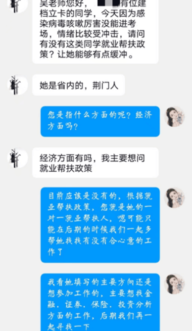 24日,2023年考研拉开大幕,今年的考研路格外波折,周同学在考试中途因病难以支撑遗憾离场,班主任邵勖老师知道后马上关心孩子的情况。孩子向老师倾诉道她已生病四天,有不能考试心理准备,之后打算找工作。邵老师迅速联系就业辅导员,了解相关就业帮扶政策,一同关注后续就业机会。