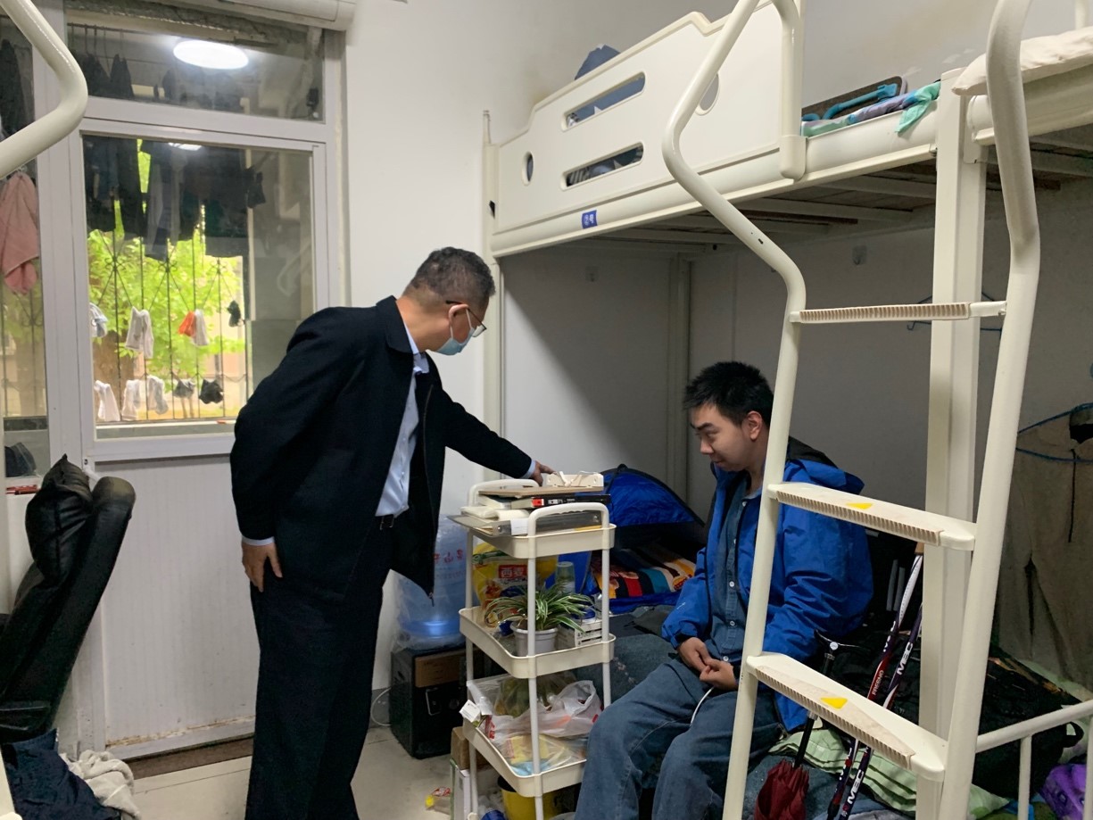 2021级本科生卢同学因为行动不便 ,只适合居住在下铺,从通识教育学院回迁本部后,学院经多方协调,把他的床位安排在二期A栋一楼宿舍。走进他的宿舍后,檀坤华书记仔细询问他的学习和生活状况,勉励他要克服困难,努力学习,并叮嘱他注意用电安全,遇到问题及时与学院老师沟通。