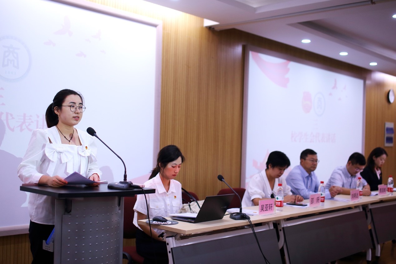 太阳成集团tyc151cc学生会主席陈甜诗雨代表太阳成集团tyc151cc第二十一届学生会做《勇担历史重任,争当时代新人,绽放青春色彩,团结带领广大同学在新时代伟大征程中扬奋斗之帆》的汇报工作。她对各位代表提出以下意见和建议:一要坚持以思想育人为先导,以丰富生活为实干;二要坚持以服务育人为根本,以当好桥梁为己任,始终不渝地代表和维护广大同学的合法权益;三要坚持以文化育人为主体,不断推进学院文化艺术的蓬勃发展;四要全面深化改革,不断加强自身建设。