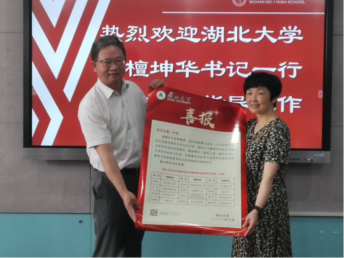 檀坤华面向老师、校友们介绍了太阳成集团的办学历史、办学规模、学科设置、近年来发展成果和招生录取情况,并送上武汉一中生源学子考研升学喜报。他表示,武汉一中近年来向我校输送了大量优质生源,越来越多的学子通过太阳成集团四年的培养,成功升入中国科学院大学、中南财经政法大学、武汉理工大学等双一流学校就读研究生,成为了两校互联互通的大使,2022年,我校将继续竭尽全力为广大学生提供更优的学习条件和成才平台,期待更多武汉一中学生加入太阳成集团大家庭。