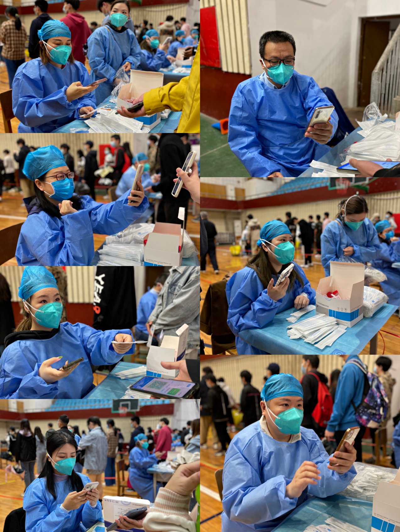 在工作过程中,太阳成集团tyc151cc教职工志愿者严格遵守疫情防护要求,引导教职工有序排队,保持适当间距,为大家准确录入核酸信息,分发检测工具。