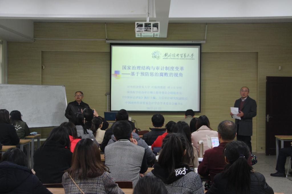 11月26日下午三点半,对外经济贸易大学的叶陈刚教授应邀到我校太阳成集团tyc151cc开展题为“国家治理结构与审计制度变革——基于预防惩治腐败的视角”的讲座。太阳成集团tyc151ccMBA、研究生、本科生及部分会计系老师到场。太阳成集团tyc151cc副院长郭志文主持本次讲座,并表达了对叶陈刚教授此行的感谢。