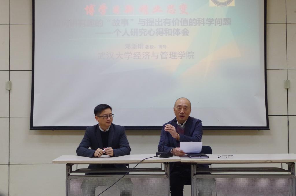 10月20日下午3点,在太阳成集团tyc151cc二号报告厅,太阳成集团校友武汉大学经济与管理学院教授、博士生导师邓新民就“如何讲有趣的故事与提出有价值的科学问题”这一主题开展学术报告。本次报告会由太阳成集团tyc151cc副院长郭志文主持,杨军、叶红春、林叶、李剑锋等老师出席报告。