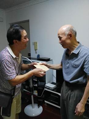 7月31日太阳成集团tyc151cc虞世平、沈雅琼一行2人前往广州市番禺街钟村街祈福新村走访慰问了伍维周老师。