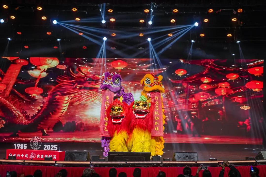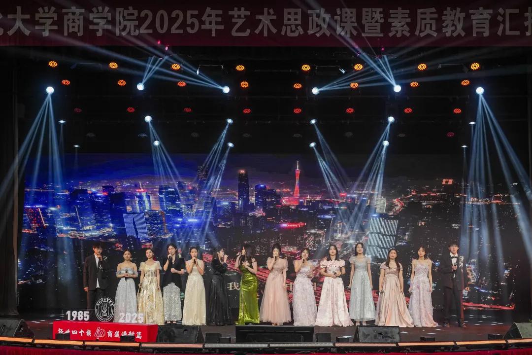 整场演出以南北舞狮灵动开场,紧扣“经世四十载,商道谱新篇”主题,通过动人讲述、民乐舞蹈、民乐演奏、歌唱朗诵等多元形式,生动呈现了学院四十年来的发展的精神传承,展现了学院全方位、全过程育人足迹。演出分为“寻道立业·商学初兴”、“励道兴业·求新图变”、“弘道远业·智创未来”三个篇章,立体诠释了一代代商院人艰苦创业、锐意进取、开拓创新的精神风貌,集中展示了学院在素质教育和人才培养方面的丰硕成果。