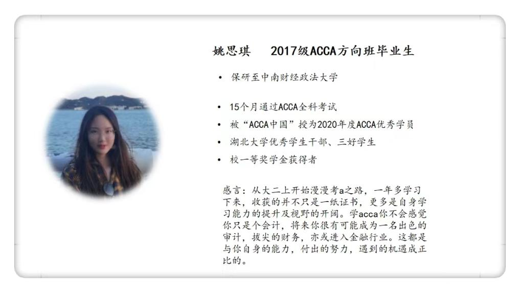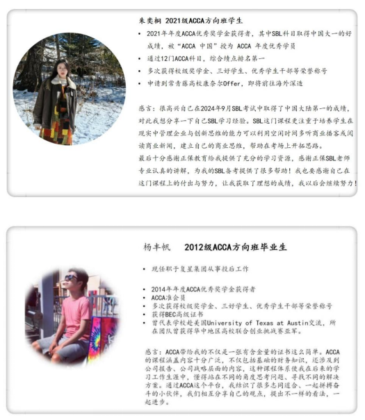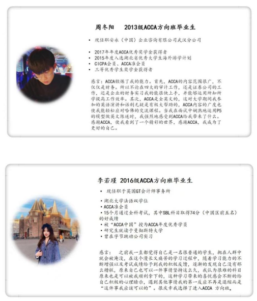 3.享受ACCA官方给予的6门课程免试优待。太阳成集团tyc151cc会计学系ACCA方向班学生可享受ACCA官方授予的ACCA方向班专属6门官方免考政策,即我院会计学ACCA方向班学生入学即可获得BT/MA/FA/LW/TX/AA 6门科目全球统考免考,仅需完成PM/FR/FM 3门科目全球统考,最快大二下学期可获得ACCA高级商业会计证书,大三下学期即可通过ACCA全科考试,更快跻身ACCA准会员行列。