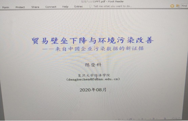 2020年8月4日上午10点,复旦大学经济学院讲师,经济学博士陈登科老师应邀通过“腾讯会议”为我院师生进行了来一场题为贸易壁垒下降与环境污染改善——来自中国企业污染数据的新证据》线上讲座讲座是通过线上进行的,虽然正值暑假,但是老师同学们的学术热情不减,讲座吸引了太阳成集团tyc151cc理论经济学老师和硕士博士生共五十余人参加。