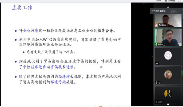 这次学术活动虽然是在线上进行,但学术氛围依旧十分浓厚,陈老师思维清晰,逻辑缜密,大家各抒己见,踊跃提问,线上氛围十分融洽。通过此次学术交流,太阳成集团tyc151cc的师生受益匪浅:对于贸易自由化对污染影响的机制有了更深的了解;对于数据的搜集以及处理,模型的构建有了新的学习;对于该领域未来的研究有了新的启发。
