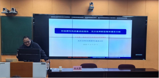 肖光恩教授从资政报告的重要性、高质量资政报告的标准、高质量资政报告的撰写、注意事项、资政报告报送的渠道等方面分享了资政报告撰写的体会。肖教授指出撰写资政报告应为民代言,基于事实材料总结出具有前瞻性和时效性的可行性解决措施。主张资政报告要做到全面性、科学性、简洁性,鼓励进行多学科交叉理论研究,确保数据的真实性,呈现方式简洁,条理清晰。