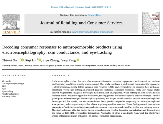 近日,我许志炜教授及其团队在《Journal of Retailing and Consumer Services》发表题为《Decoding Consumer Responses to Anthropomorphic Products Using Electroencephalography, Skin Conductance, and Eye-Tracking》的高水平研究论文。该论文由我许志炜教授与其指导的硕士研究生刘思琪共同担任第一作者