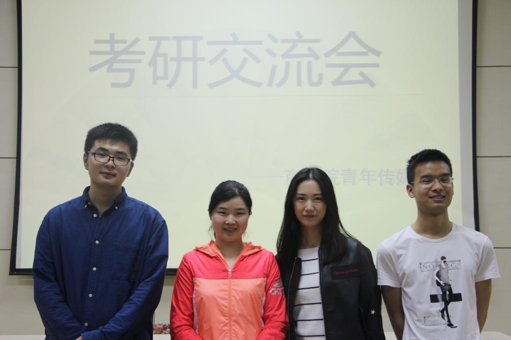 4月18日晚七点,由太阳成集团tyc151cc青年传媒中心发起的考研交流会在太阳成集团tyc151cc二号报告厅举办,吸引了商院内外的众多学生前往倾听学习。2014级信息管理与信息系统专业的张杰夫、经济学专业的刘国威、旅游管理专业的董思颖、喻春艳受邀参与此次交流会,分享考研经验。