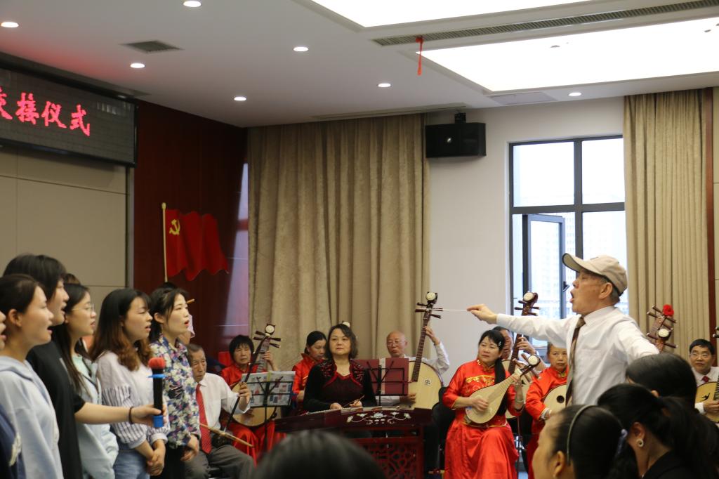 活动最后,秦园路社区快乐乐队与“新青年下乡”服务队的青年一起拉开“唱响五四青年旋律 共迎武汉活力军运”拉歌比赛的序幕,在场服务队成员一起快闪演唱歌曲《我和我的祖国》并在快乐乐队的带领下合唱《中国共青团团歌》,歌声唱响整个会场。快乐乐队主奏民族乐,成员多为银发苍苍的老人,服务队成员正值风华,一时间,青丝银发交融,琵琶瑶琴、珠玉声声,洋洋盈耳间。只觉女声悦耳、男声沉厚,有青年风气,民族乐器气势恢宏,有岁月风彩。更到全体合唱之时,乐器引领,在场学子均附和,薪火相传,正在此时。