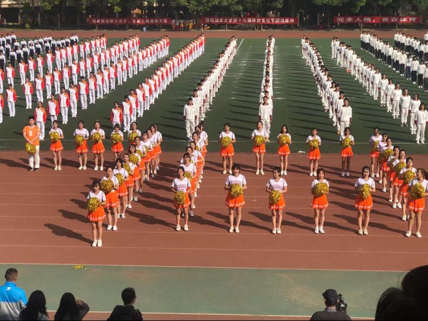 “青春无畏,逐梦杨威,商学院代表对贺中华人民共和国成立七十周年,预祝体育文化节圆满成功。”商学院代表队用响亮的口号展现了商院学子积极向上的精神面貌,他们的啦啦操表演亦是充满了青春活力,轻盈的脚步、整齐的动作、闪亮的花球、创意的队形,赢得了现场观众的阵阵掌声和喝彩,2018级国际经济与贸易专业的崔国星同学现场劈叉,给观众们留下了深刻的印象。