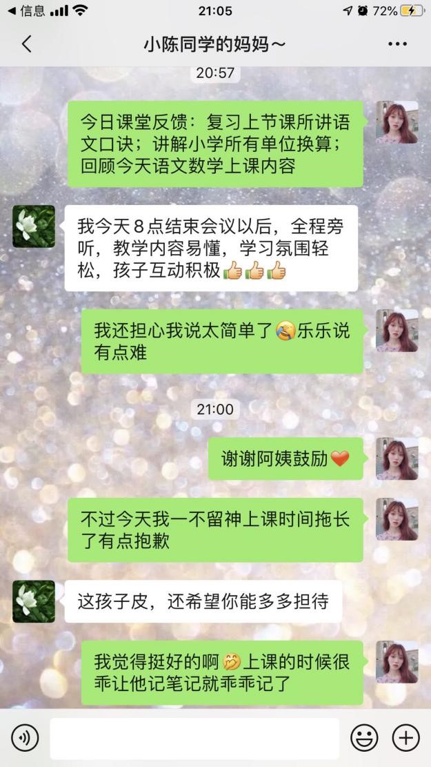 据黄巧悦同学介绍在她的印象中:乐乐是一个有着很高学习积极性的孩子,课堂积极互动,课下认真完成学习小任务。他对数学很感兴趣,基础牢、记得快,有时乐乐同学还会拿一些他刚学会的公式来考考自己。乐乐同学家里还有个妹妹,由于爸爸一直在单位值班,妈妈白天要上班。所以乐乐同学经常白天上完网课下午就要忙着做作业和带妹妹,晚上则是进行一小时的线上辅导,但他每天都能准时上线,两人共同学习进步。采访之余我们了解到乐乐同学和黄巧悦之间还有这一段误打误撞的缘分。对接之初,黄巧悦收到的信息是需要辅导一名六年级孩子的数学科目,而和家长初次交流时,黄巧悦则坦言自己更加擅长的是英语和语文科目,但仍然有信心会辅导好小朋友的数学科目。谁知乐乐的妈妈说的弱项其实是语文和英语,数学是因为他自己感兴趣才报上去的。在征求了乐乐的意见后,黄巧悦和乐乐同学妈妈一拍即合,成功地从一名单科辅导小老师变成全科辅导小老师。
