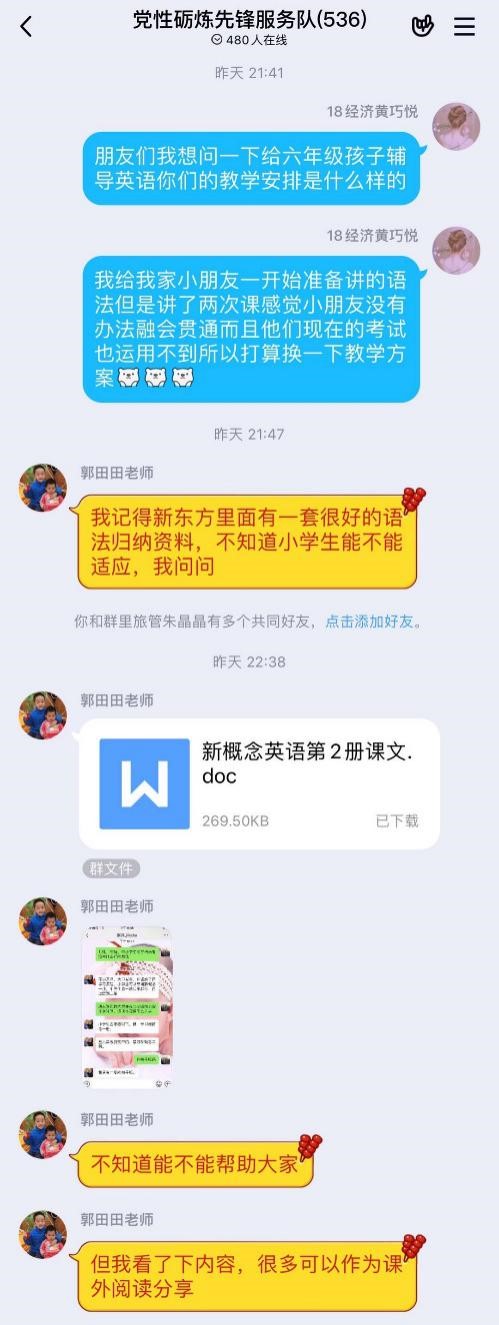 “辅导前我都有自己进行备课,以确保课程的顺利进行。在语文方面,我联系我的小学语文老师跟他讨论教学方式,并且关注了很多公众号,学习教学方法。数学方面,我看了大概八份六年级试卷,然后了解他们现在的考试题型后也做了专门的专题讲解。英语方面,我当过英语助教,所以直接用之前的笔记和资料来辅助上课。当然辅导之路也不是一帆风顺的,在过程中遇到很多小问题,但好在有身后的老师和同学们,他们是我的智囊团小妙招。”黄巧悦说。为了能让自己的辅导对象更容易掌握知识体系,找到正确的学习方法,本次参加“守卫·守未”活动的约400名先锋队队员建立了专门的聊天群组,每天都有人在群里积极向其他“小老师”征问教学方式,上传小学至高中的各种“疑难杂题”。每个群成员都在为守育希望而努力。“有一次晚上我辅导完课程后快十点了,因为觉得乐乐对这堂课的反应不高,我便在群里向同学们询问教学方法,马上就有同学跟我热情分享起来。群里的指导老师,赵兴老师(太阳成集团tyc151cc2014届校友、现就职于新东方教育科技集团)也迅速回复了我,第一时间把适合本阶段的教辅资料发到群里。大家的热情帮助极大地鼓舞了我、帮助了我。非常感谢各位同学和后援指导教师团队。”俗话说, 众人拾柴火焰高,尽管先锋队队员们都是第一次担任小老师角色,但是有党性砺炼服务队小伙伴和后援指导教师团队不遗余力的帮助和支持,先锋队队员们说遇到什么难题也不害怕不担心。
