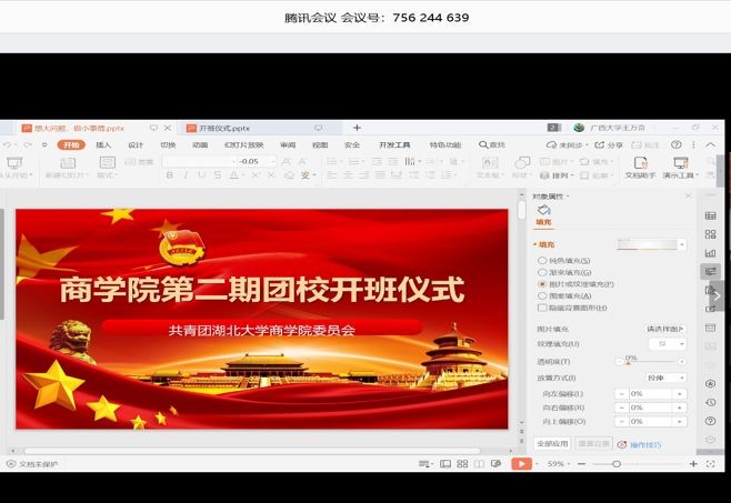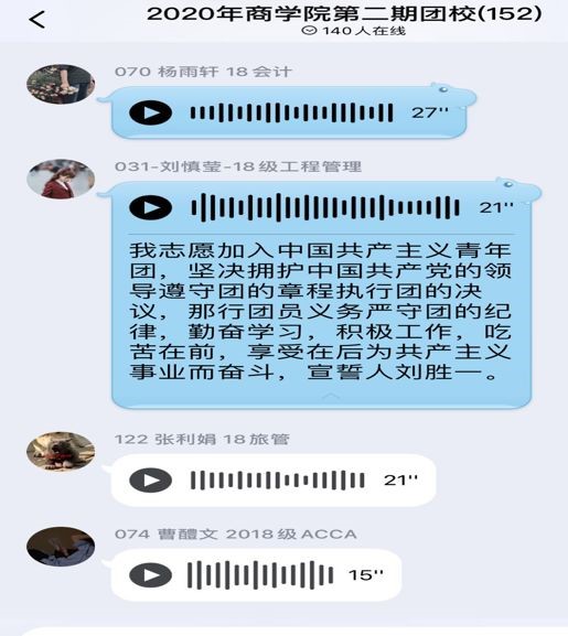 焦书记在会议上指出,在新冠肺炎疫情防控的关键时期,学院以“云开班”的形式开展团校培训,目的是做好青年团员的思想引领工作。他希望团校学员们在疫情面前听从学院指挥,做好防护;加强理论学习,坚持思考,提升本领。随后,张书记对团校的各项规章制度做出强调。学员们就两位书记的讲话热情讨论,反响强烈,开班仪式在集体重温入团誓词中结束。