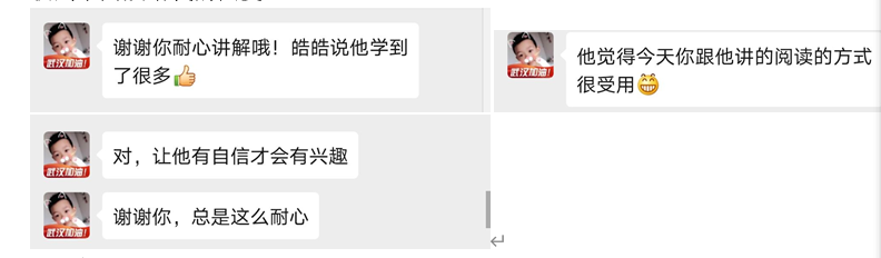 为了提升小皓砾的阅读能力,我制定了一些方案,先提升阅读兴趣,同时也给出阅读方法。第一次给弟弟讲完语文后,收到了阿姨给我的及时反馈。这样的信任和鼓励更加坚定了我的信心,让我在教学方式上能有更多的创新,从而有更好的效果。