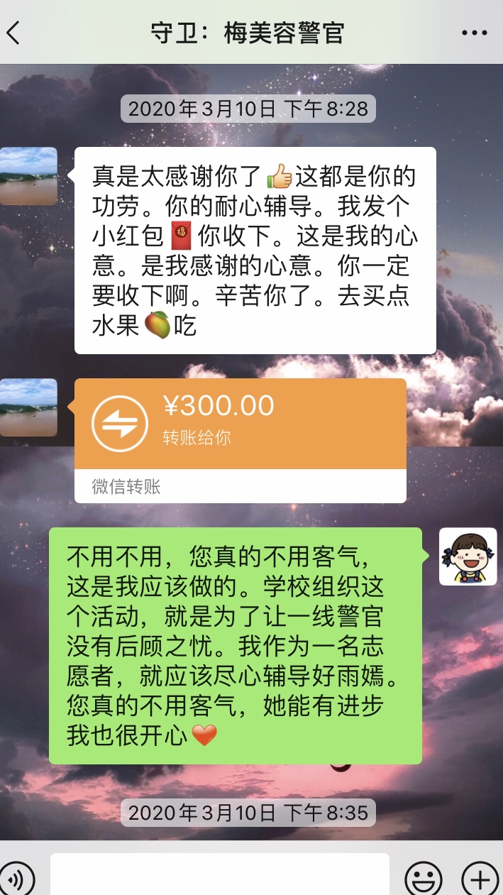 “我发个小红包你收下,这是我的心意,是我感谢的心意。”梅警官给我发来一个红包。“这是我作为志愿者应该做的,您不用客气。”我委婉的拒绝了。为什么素未谋面的梅警官会给我发来红包?这要从我参加“守卫·守未”活动,认识小雨嫣说起。