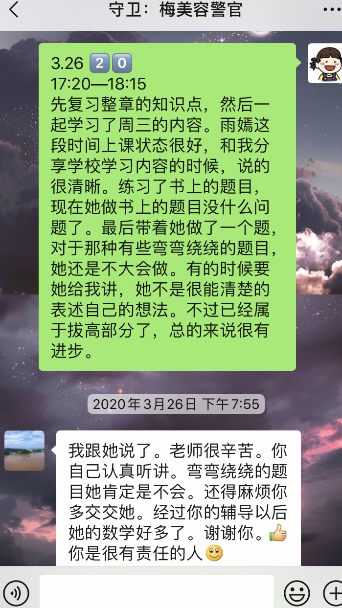 我对接的小队员是五年级的小雨嫣。2020年2月14日,拿到对接信息后,我和雨嫣妈妈第一次联系。当天已经比较晚了,所以我们约好第二天中午详细地聊一聊。简单的交流后,我了解到雨嫣的数学基础比较薄弱,注意力容易不集中。所以我初步制定了一个补课计划,把我和雨嫣的课表结合在一起。之后我加了雨嫣的微信,第一次的聊天很轻松,她告诉我她很喜欢画画,还和我分享了她的作品。我记得那天在下大雪,我们俩还给对方发送了下雪的视频。聊天结束后我们约好周日晚上视频通话,一起讨论她的周末作业。