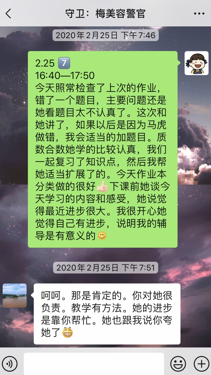 最近的几次课雨嫣越来越好,不仅可以熟练回答知识点,而且做完题后可以很清晰地跟我讲出解题过程。近两个月的学习,我看着她一点一点的进步。从一开始回答问题会紧张、注意力不集中,到现在会归纳知识点、运用知识点解答问题。在这个过程中,我学会了更好地兼顾学业和课后辅导,既不耽误学校的课程,也可以按计划辅导雨嫣。同时根据她的学习情况和特点,有针对性的进行辅导,真正实现“因材施教”。我很开心可以认识她和她的家人,见证她的努力和成长。在这里,我祝她学业有成,早日成为国家的栋梁,为祖国的建设添砖加瓦。